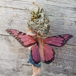 Del mismo modo destacan sus bellas alas con formas y fantásticos colores inspirados en los de las maravillosas mariposas. Su largo pelo de fábula sujeta con mimo una gran corona de musgo muy característica en esta hada. Vistiendo con colores inspirados en tonos mágicos de las zonas más boscosas, donde ella habita, atrae cualquier mirada que hacia ella se dirije. Ya sea de niños o mayores todos caen ante sus encantos. Motivo por el cuál esta fabulosa artesanía nunca pasa desapercibida.